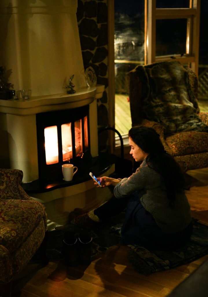 She is physically present in the warmth, but mentally, she is in a comment section somewhere, arguing with a stranger. The fire crackles unnoticed, a forgotten background app running in the physical world while the digital mind wanders elsewhere.