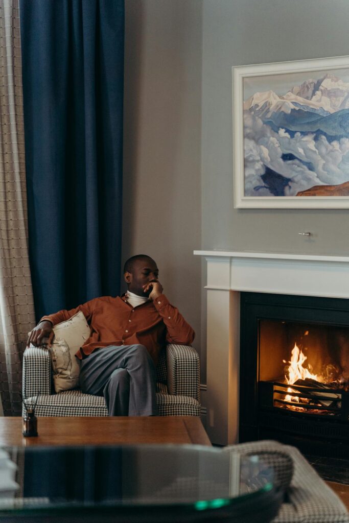 Every man needs a chair by the fire where he can sit and look misunderstood. This setup is the cockpit of the mid-life crisis. The posture says “deep thinker,” but the vibe says “regretting that boat purchase.”