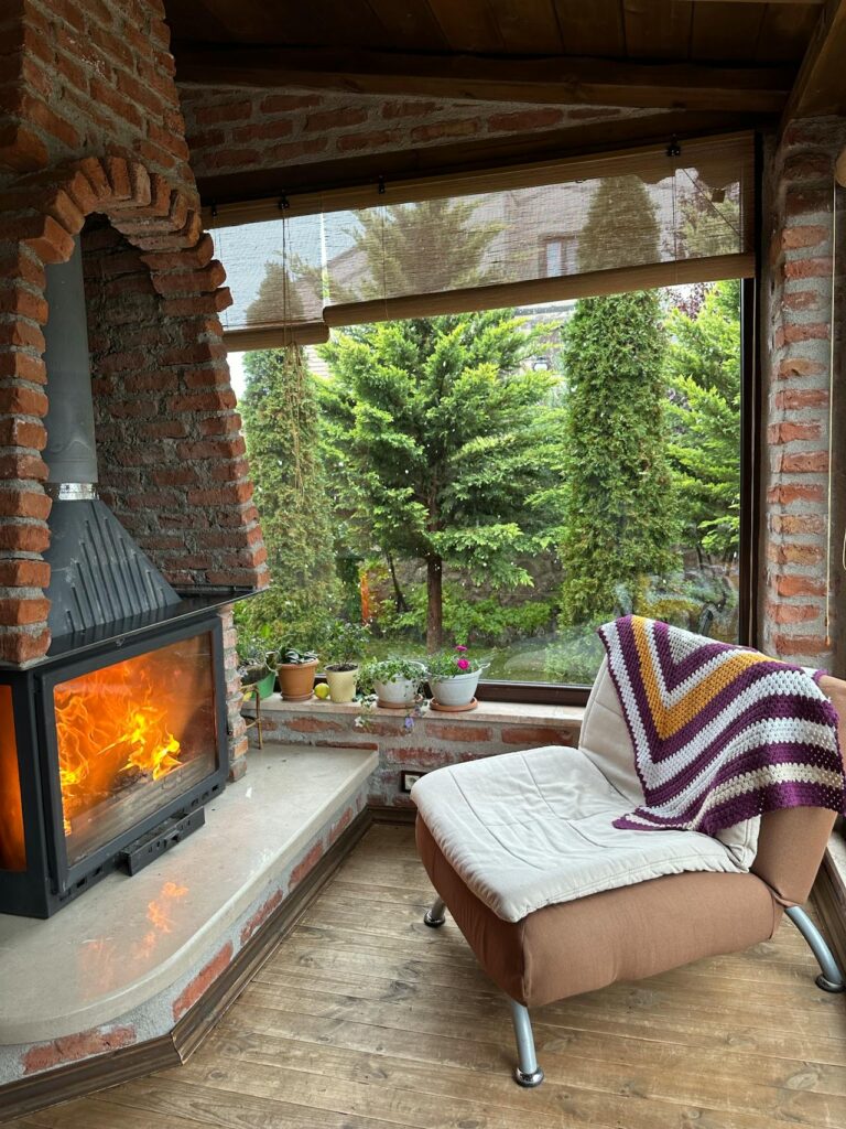 There is something aggressively vintage about reading a physical newspaper next to a wood-burning stove. It is a performance art piece titled “I am ignoring the Internet.” This fireplace corner creates a perfect bubble of denial.