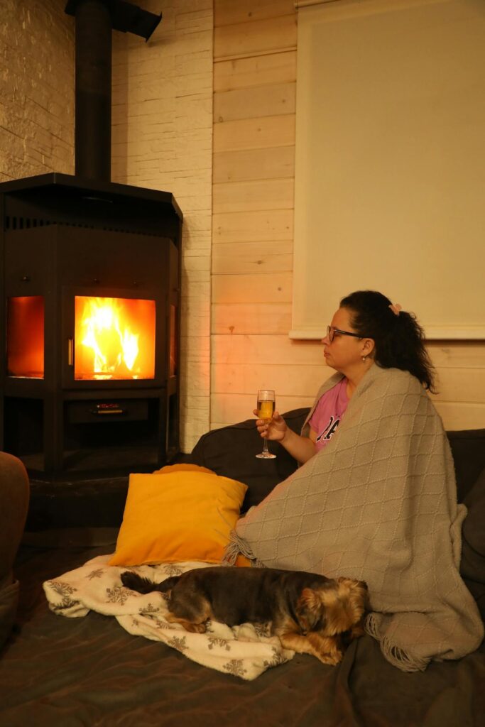 When humans fail you, there is always the dog. This image captures the purest form of fireplace enjoyment: shared silence with a beast that doesn’t know how to judge your life choices. The stone hearth is rugged and authentic, unlike your dating profile.