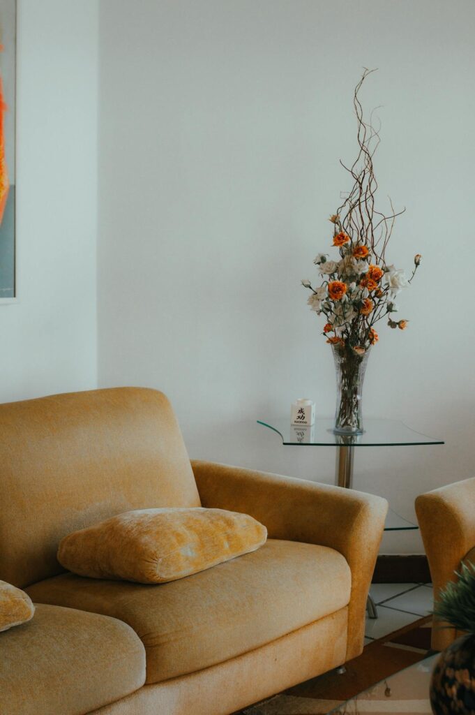 Sometimes, in a desperate attempt to feel something, the minimalist will introduce “organic elements.” Here, the floral decor attempts to breathe life into a room that feels like a preserved museum exhibit. But notice the contrast: the dried or muted flowers do not suggest blooming life; they suggest preservation and stasis.